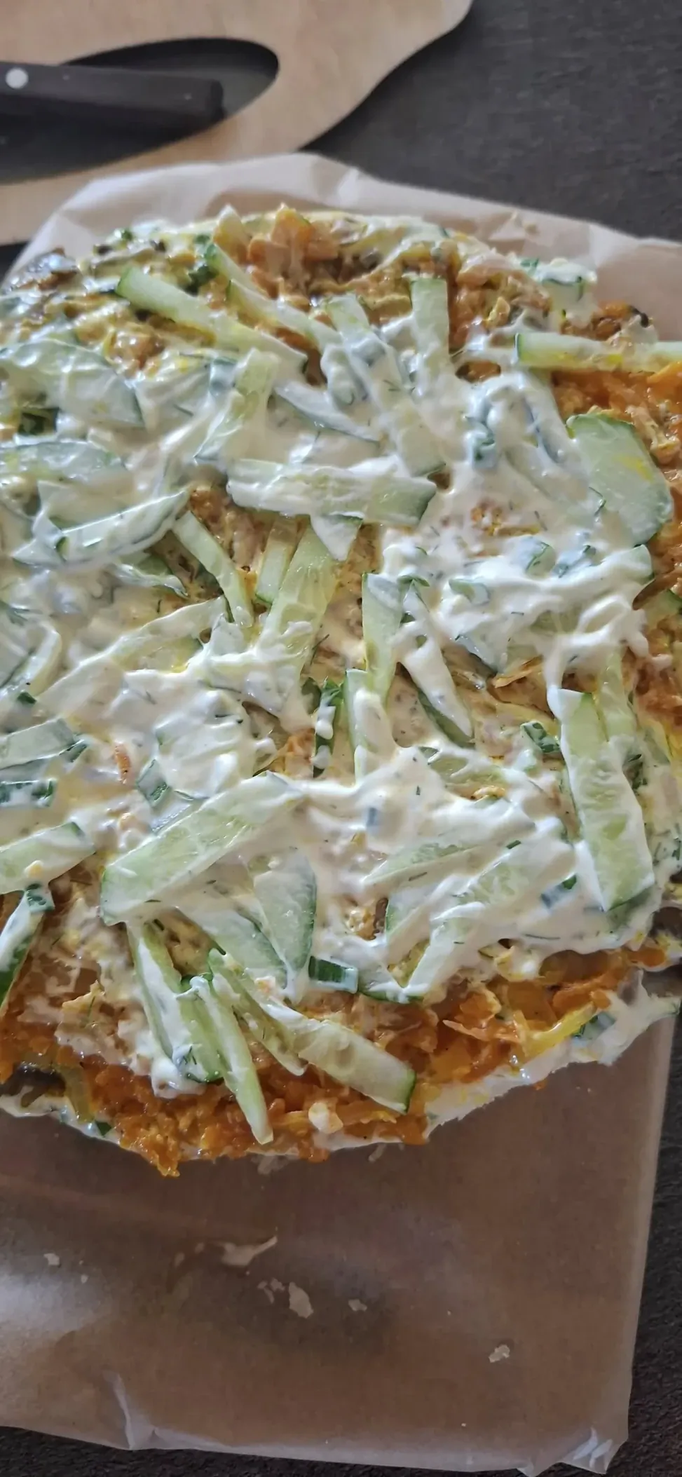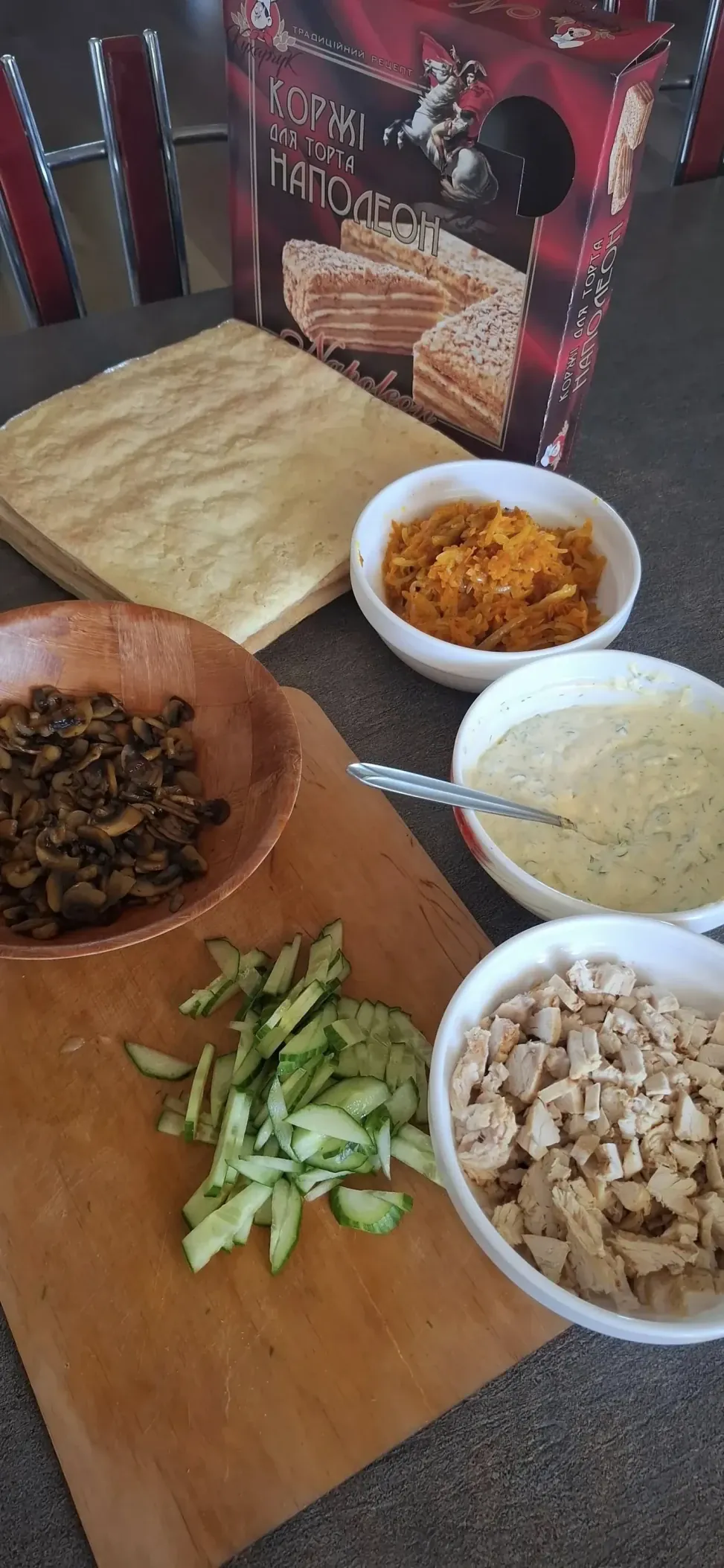 Sluoksniuokite tortą: pirmiausia dėkite Napoleono lakštą, patepkite padažu, paskleiskite morkas ir agurkus.