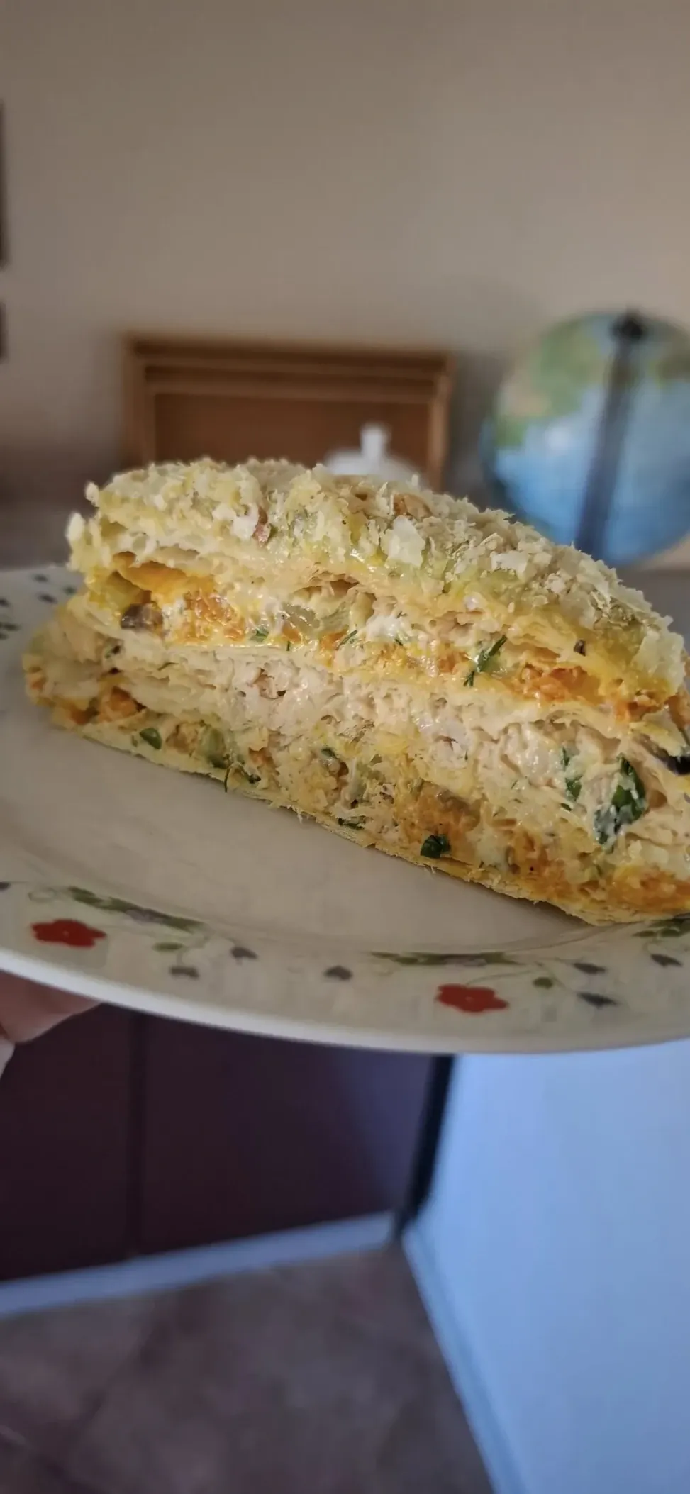 Napoleono tortas su vištiena ir keptomis daržovėmis