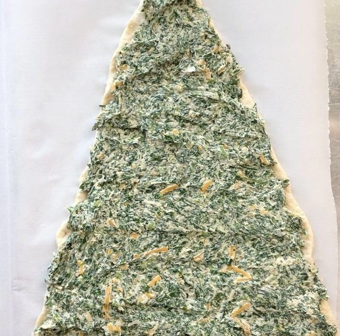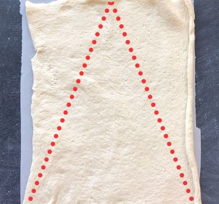 Iškočiokite tešlą ir iš jos išpjaukite trikampį, kuris bus būsimos eglutės forma. Jums reikia dviejų tokių gabalų.