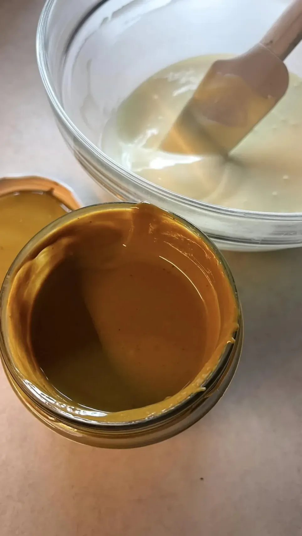 Atskirame inde ištirpink baltąjį šokoladą. Įmaišyk pistacijų pastą, sezamų pastą ir kardamoną.