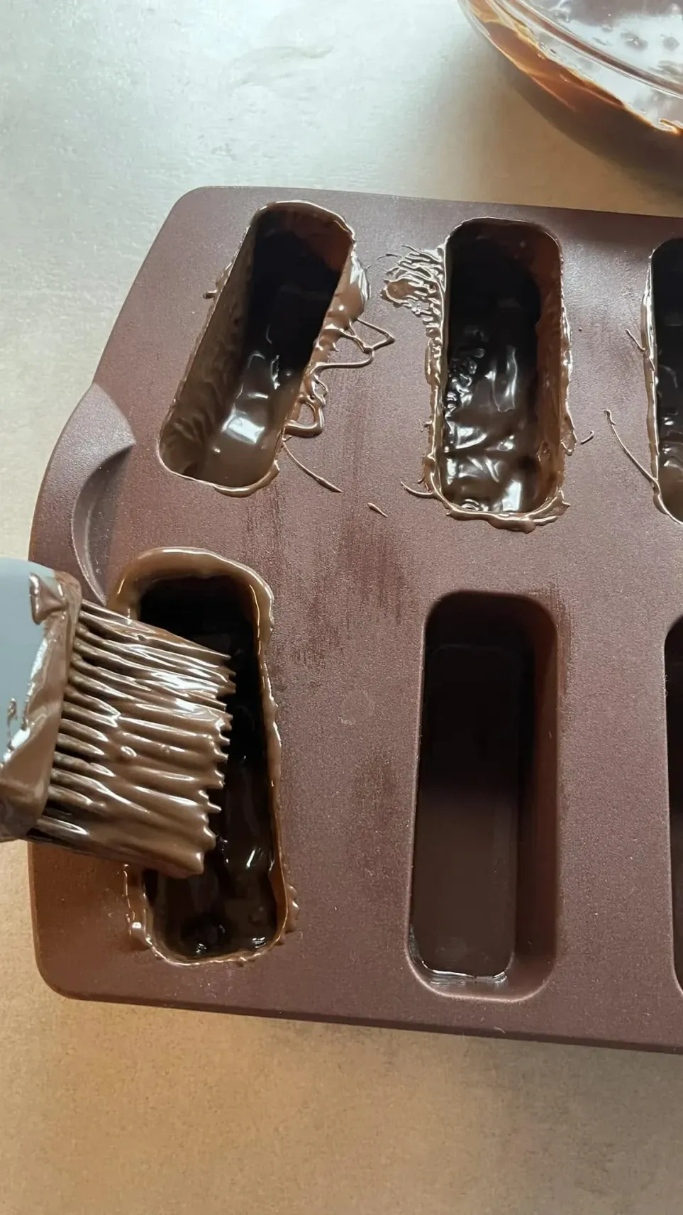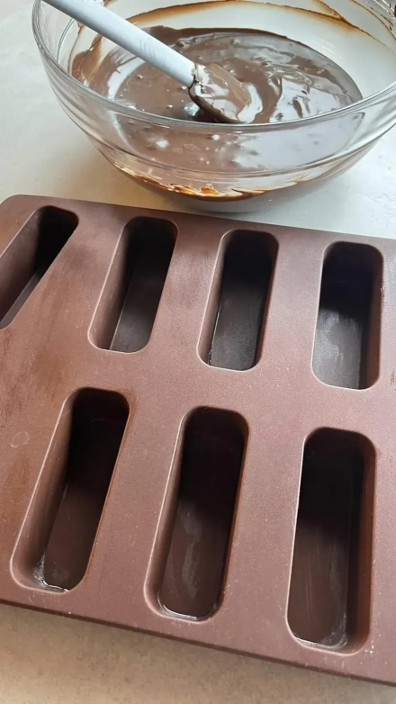 Silikoninėse formose ar tortinėje plonu sluoksniu paskleisk ištirpintą pienišką šokoladą. Padėk į šaldiklį kelioms minutėms, kad sustingtų.
