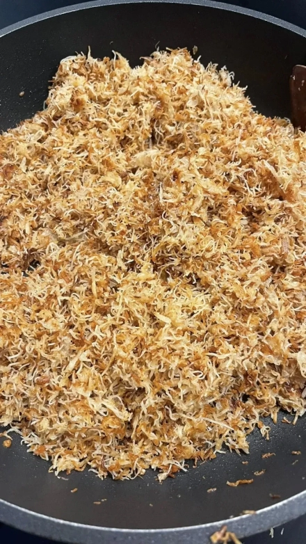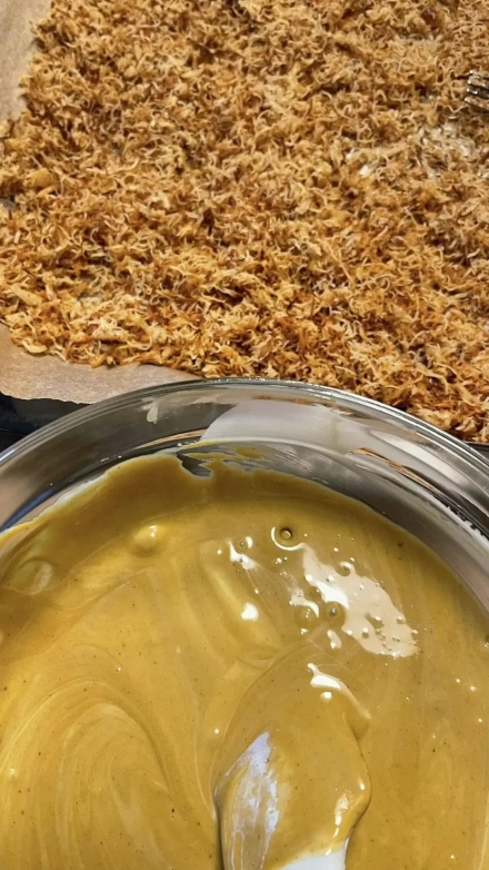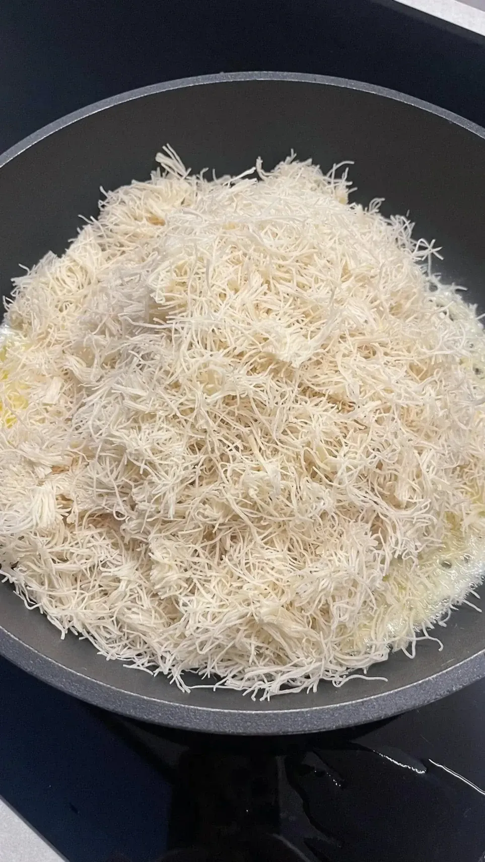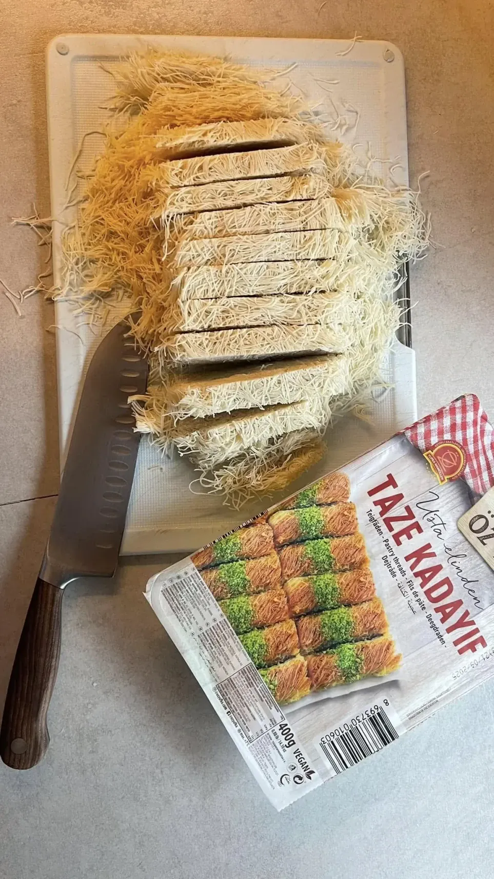 • Kataifi tešlą susmulkink kuo smulkiau, kad įdaras tolygiai pasiskirstytų.