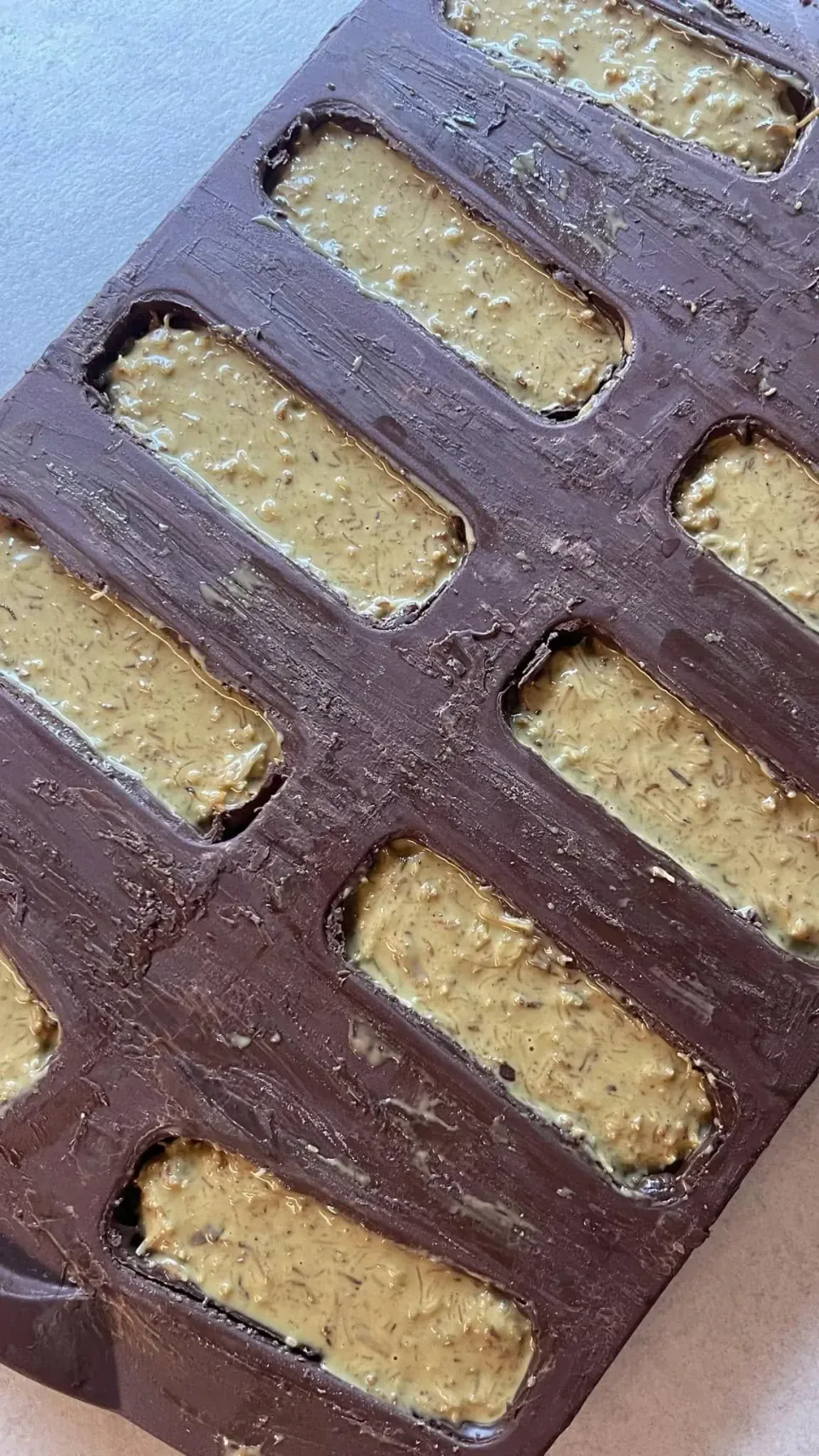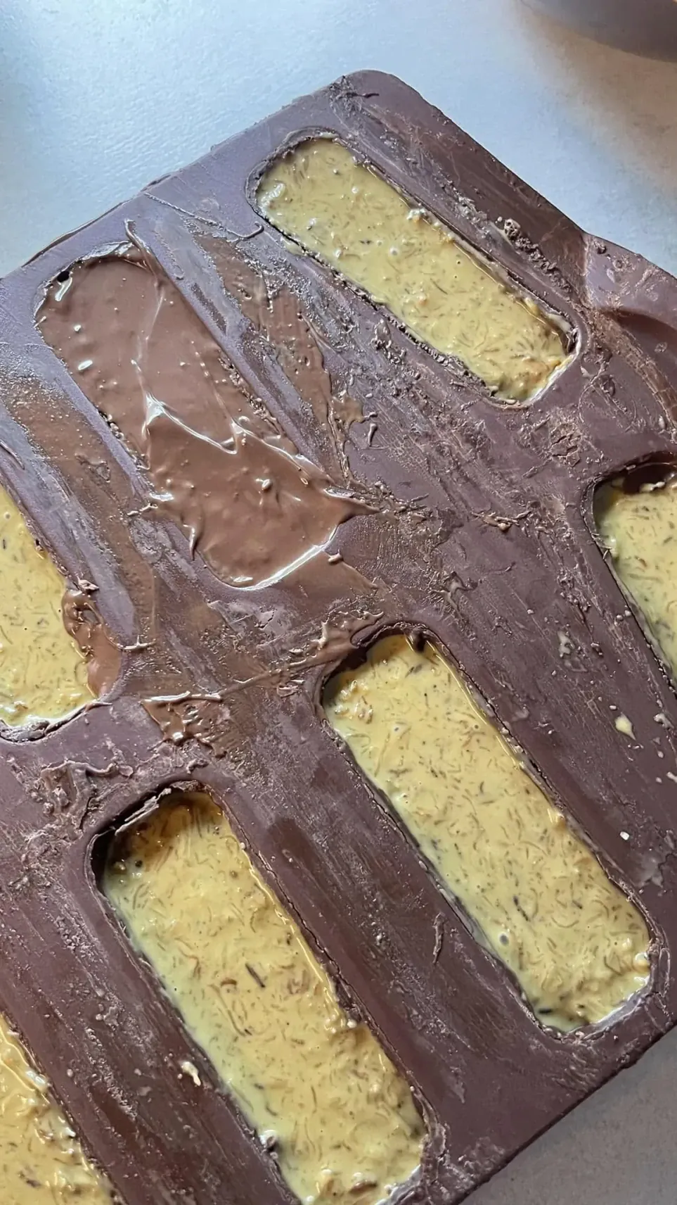 Užpilk likusiu pienišku šokoladu, išlygink paviršių ir dėk į šaldiklį bent 1 valandai.