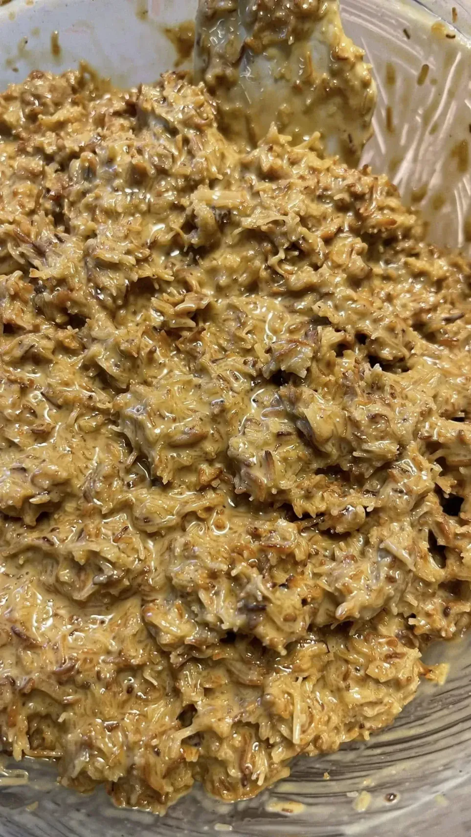 Į šokolado ir pastų mišinį įmaišyk kataifi tešlą su sutirštintu pienu. Masė turi būti tiršta, lipni, šiek tiek karamelinė.