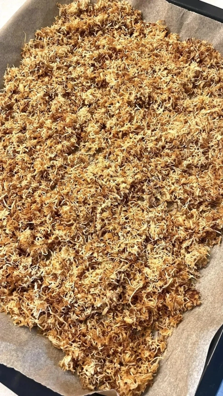 Kataifi tešlą susmulkink rankomis arba žirklėmis ir paskleisk ant kepimo popieriumi išklotos skardos. Kepk 180 °C orkaitėje 12–15 minučių, kol taps auksinė ir traški. Leisk visiškai atvėsti.