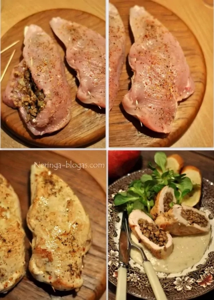 Paruoštą įdarą prikemšame į vištienos "kišenę", kraštelius sutvirtiname dantų krapštukais ir apkepame keptuvėje iš abiejų pusių.