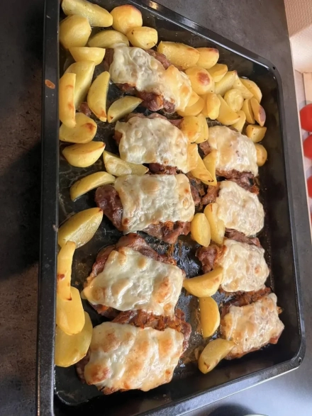Kalėdiniai kiaulienos sprandinės kepsniai su sūriu ir bulvėmis