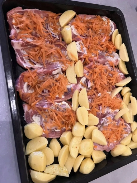 Daržovių paruošimas: Svogūnus supjaustau plonais pusžiedžiais, morkas sutarkuoju stambia tarka, ant kiekvieno kepsnio tolygiai paskirstau svogūnus ir ant viršaus užberiu tarkuotų morkų.