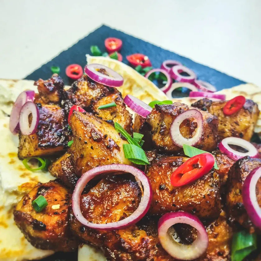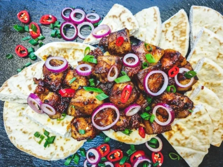 Patiekimas: plokščiaduonės pašildomos, ant jų dedami šašlykai, apibarstoma svogūnų laiškais ir čili žiedais.
