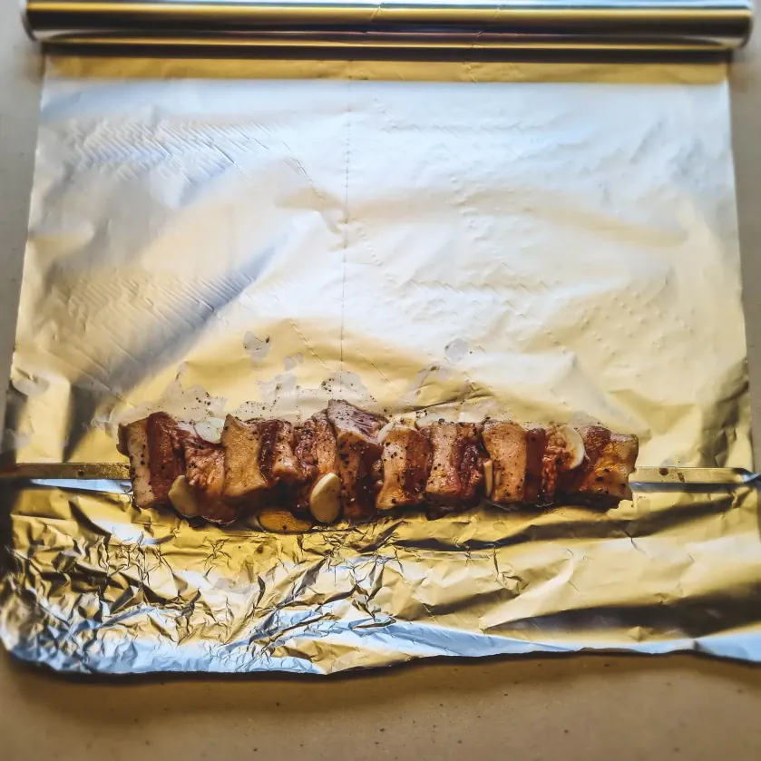 • Foliją nuimkite tik tada, kai mėsa jau apskrudusi, kad išliktų sultinga.