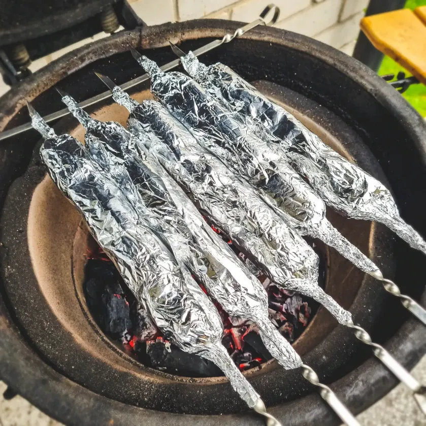Verimas ir folija: marinuota mėsa suveriama ant metalinių iešmų, tarp gabalėlių paliekant 3–5 mm tarpelius. Kiekvienas iešmas apvyniojamas dviem sluoksniais maistinės folijos, galai gerai užspaudžiami, kad sultys neišbėgtų.
