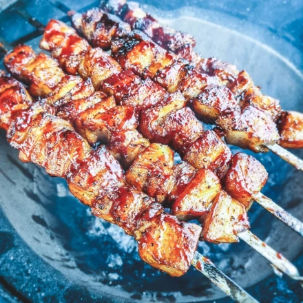 Kiaulienos pažandės šašlykai su tomato glaze ir sojos glazūra