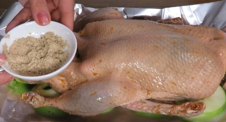 Maltą česnaką sumaišykite su raudonaisiais pipirais ir įtrinkite antį, jau išimtą iš marinato.