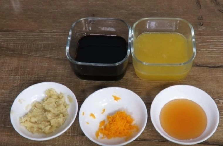 Dubenyje sumaišykite apelsinų sultis, sojos padažą, apelsino žievelę, 1 šaukštą medaus ir imbierą.
