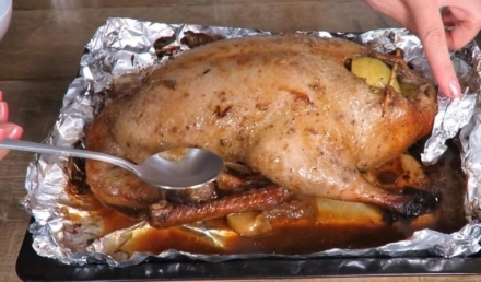 Likus pusvalandžiui iki kepimo pabaigos, išimkite antį, išpilkite sultis į atskirą indą. Antį vėl uždenkite folija ir grąžinkite kepti.