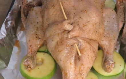 Likusius obuolius supjaustykite skiltelėmis, sumaišykite su 1 šaukštu medaus ir cinamonu, sudėkite į anties vidų. Sutvirtinkite siūlais arba dantų krapštukais.