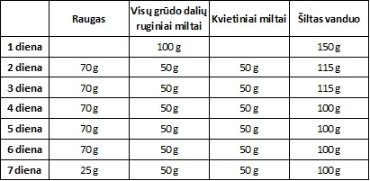 Pirma diena: pasverkite 100 g visų grūdo dalių ruginių miltų ir 150 g drungno vandens, sumaišykite švariajame stikliniame inde. Dangtelį uždėkite, bet neužsukite. Palikite šiltoje vietoje.